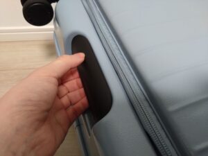 底側にも持ち手があり、空港のターンテーブルで受け取るときに便利でした。細やかな配慮でがありがたいですね。くすんだ水色も可愛く、また珍しい色でターンテーブルで見つけやすかったのも良かったです(Lサイズには白色・黒色もあります)。